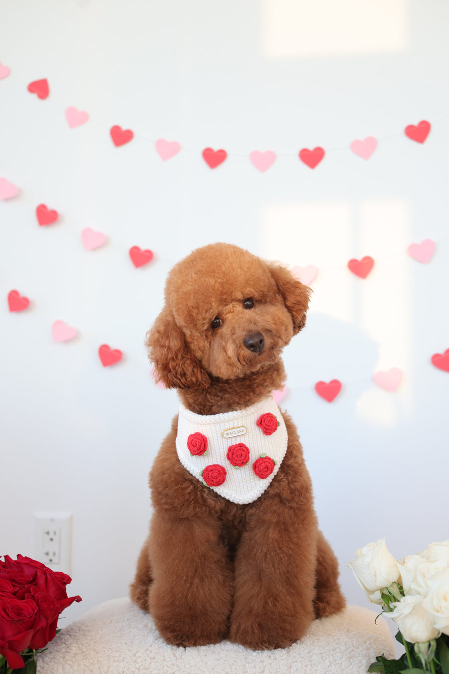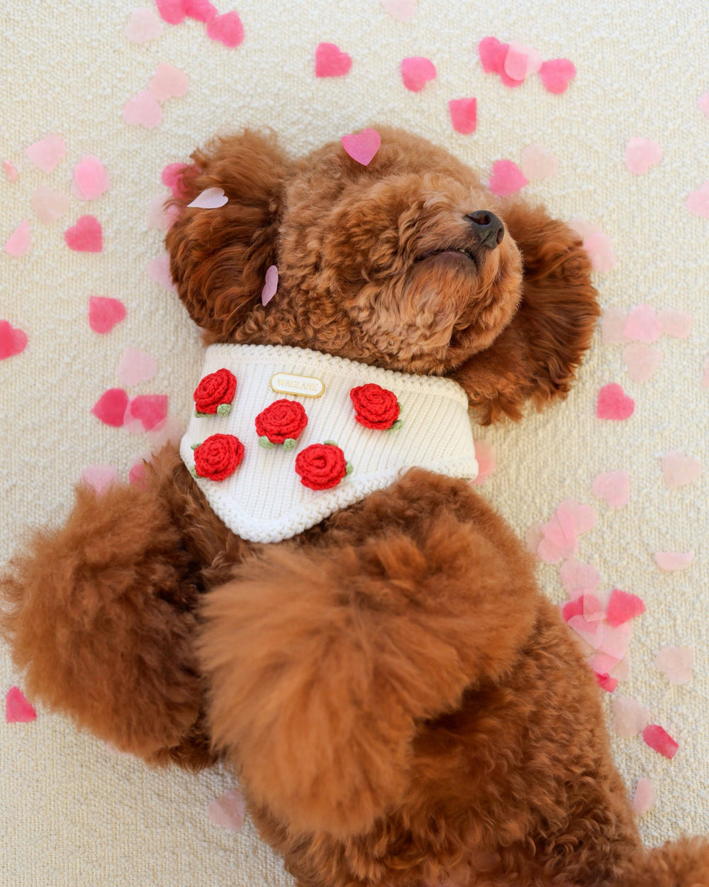 Pink knit dog bandana with 2 crochet heart-shaped balloon appliqués in ose tones, tied with a white embroidered bow and finished with a white and gold rectangular Waglane™ tag on a round white platform.