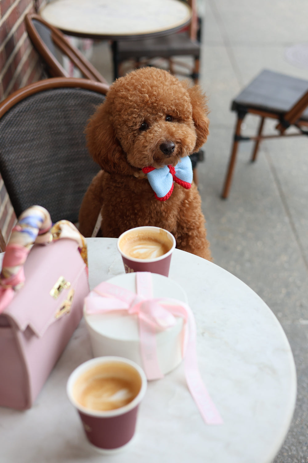 Knitted dog  bandana with crochet applique, surrounded by small bows and a candle on a textured round surface.