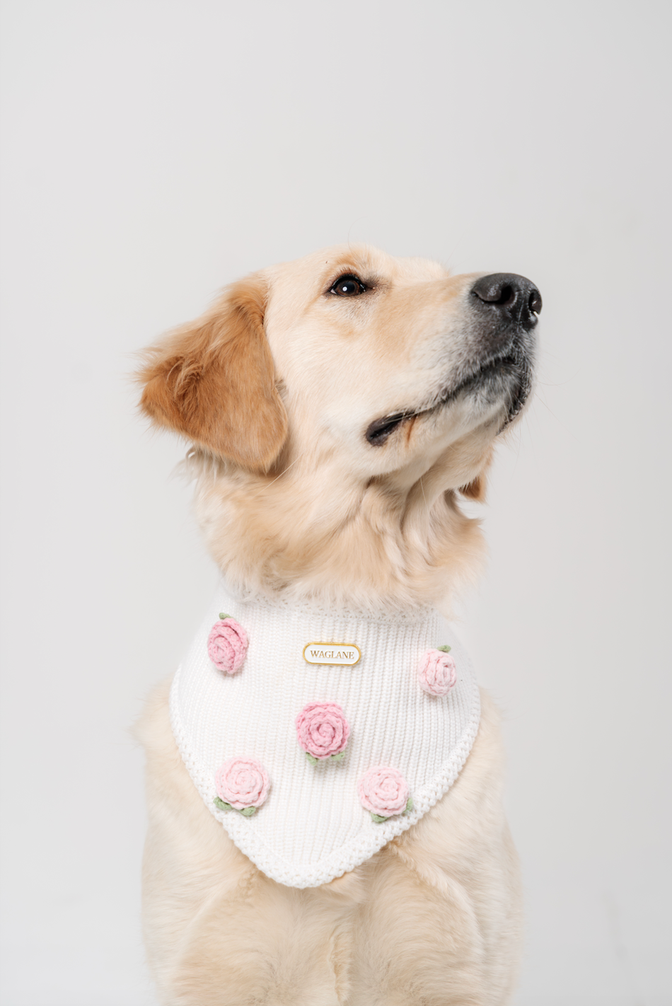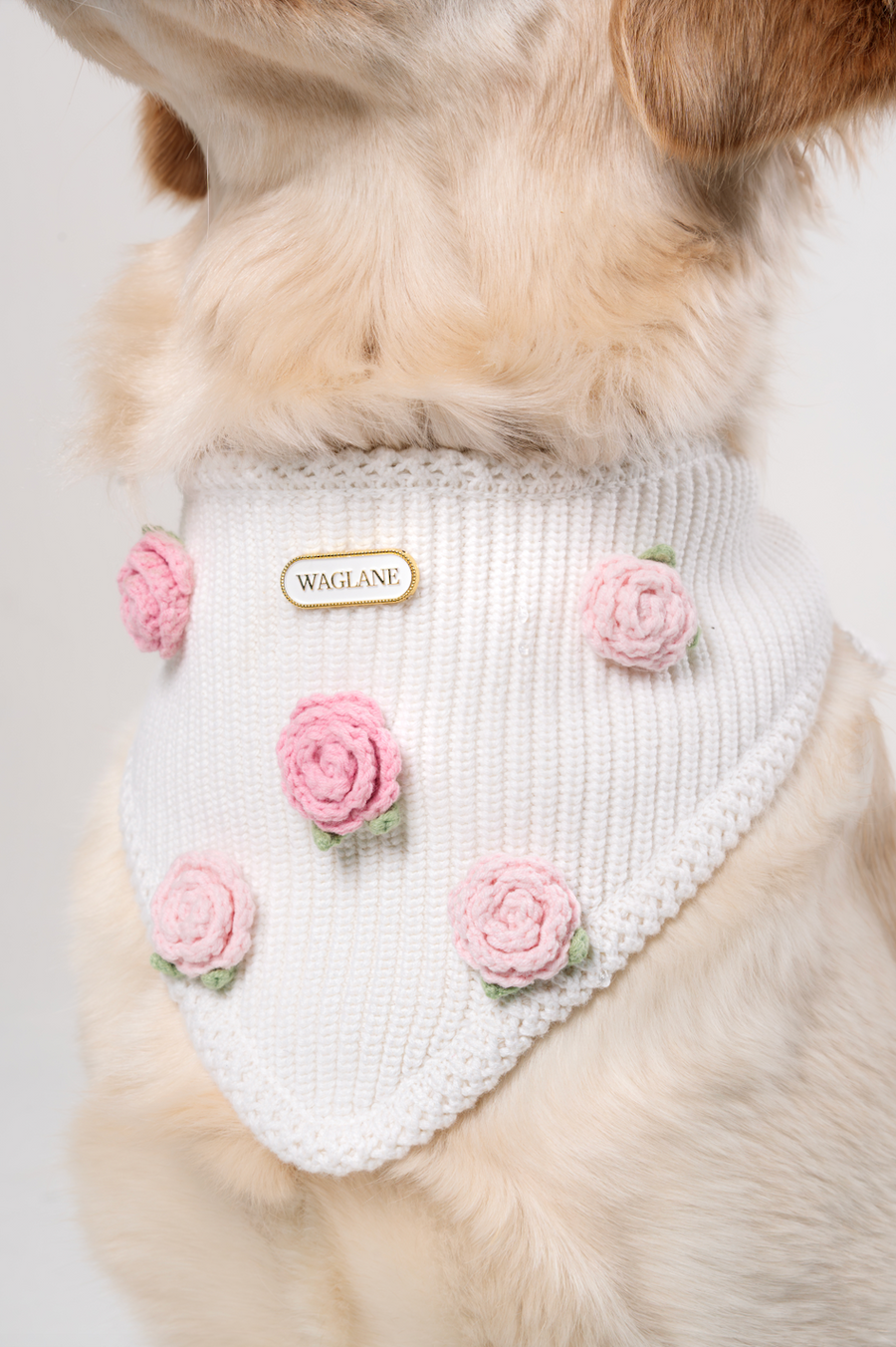 White knit pet bandana with white knitted large bow in center of bandana and 'WAGLANE' white metal rectangular label on a light plate background