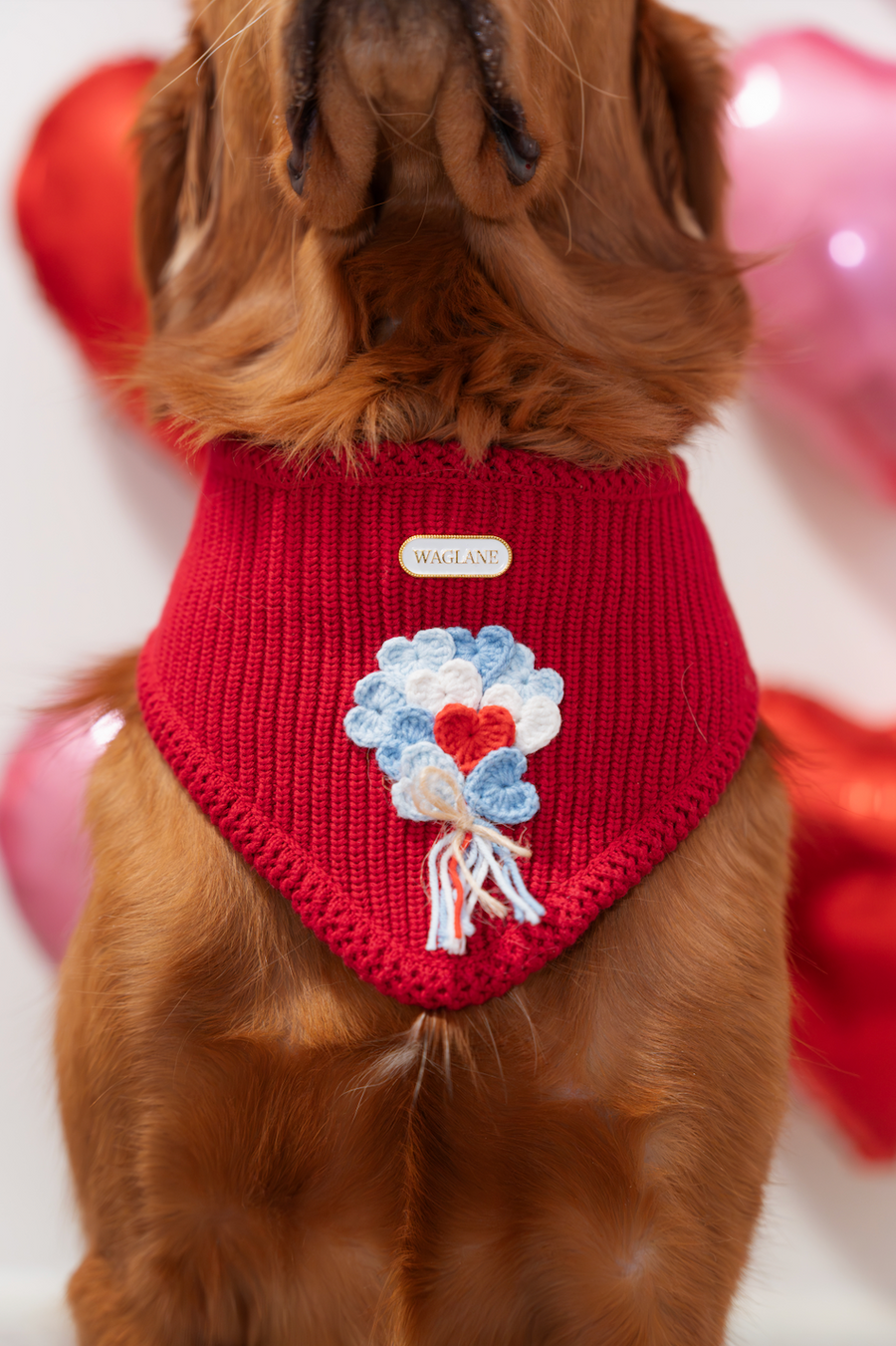 Pink knit dog bandana with crochet heart-shaped balloon appliqués in blue, lilac, and rose tones, tied with a white yarn string tied in a bow and finished with a white and gold rectangular Waglane™ logo all placed on a round white platform.
