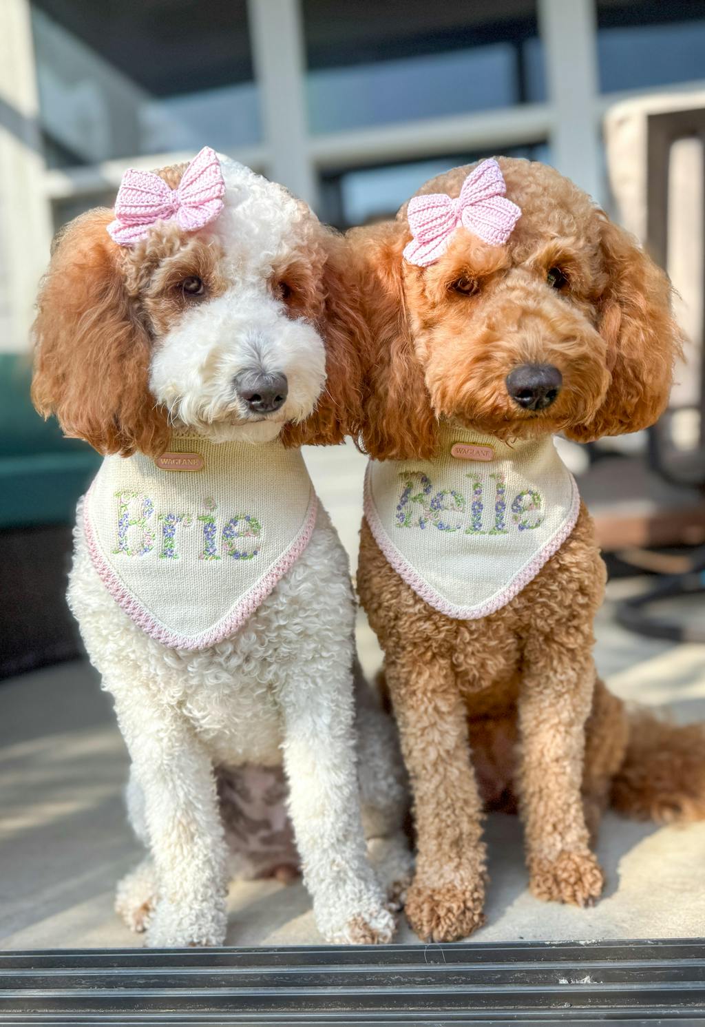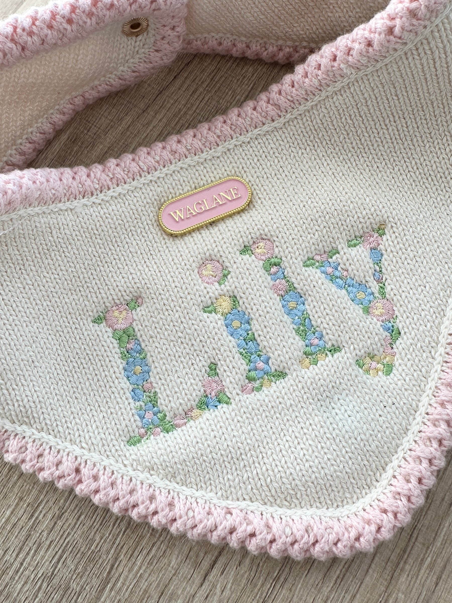 Embroidered on our signature knit base and finished with a romantic blush or blue crochet trim, this piece blends luxury, personalization, and elegance. Every piece is made to order, making each one as special as the pup who wears it.