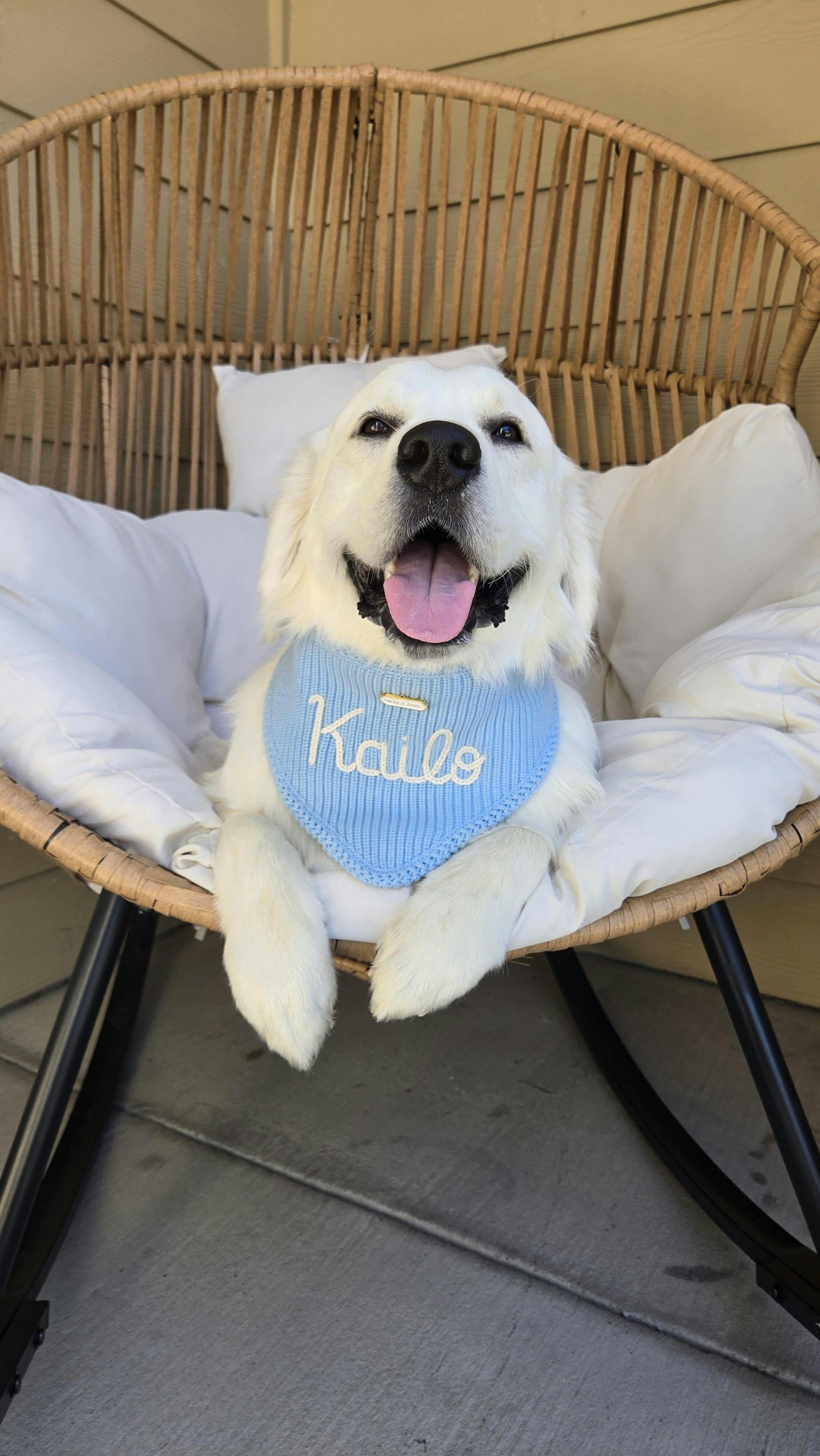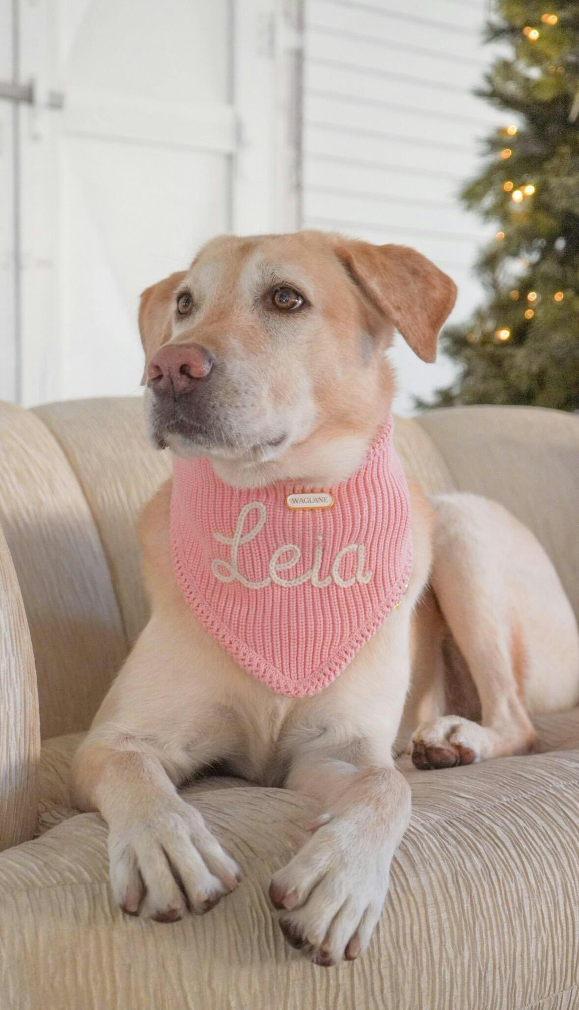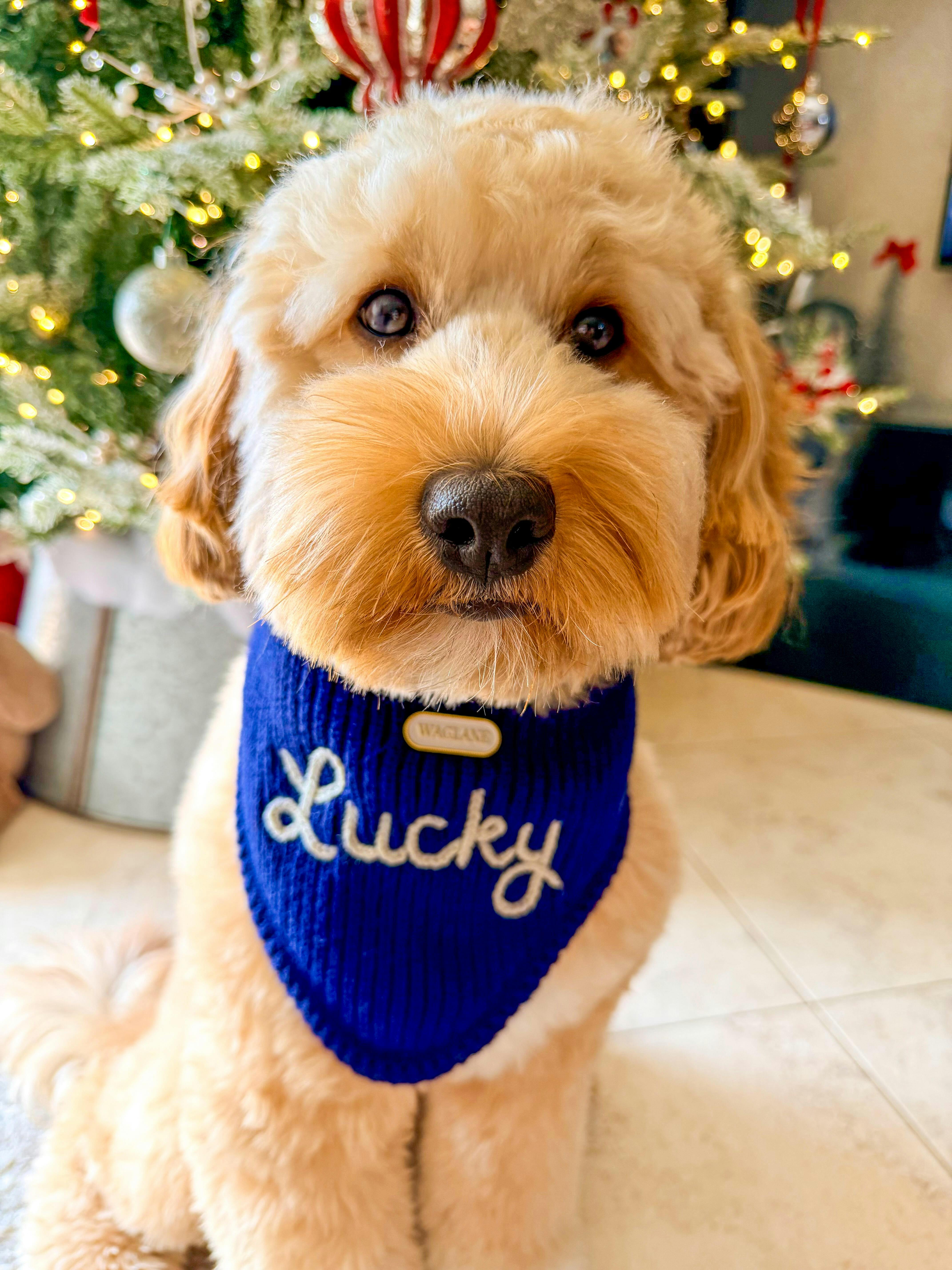 Classic, elevated, and uniquely personal, this bandana features your dog’s name or a phrase of your choice entirely hand stitched in plush yarn and framed with our signature crochet detailing. It’s finished with the iconic Waglane white and gold logo and tailored to fit like it was made for them, because it was!